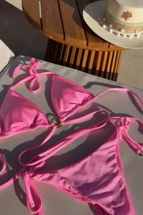 Su estilo sensual con delicados tirantes que estilizaran tu figura y su hermoso color cálido que destella bajo el sol, te convertirá en el centro de todas las miradas. Además, tiene sus exquisitos detalles como, su argolla en top y puntas decoradas, elevaran tu bikini a otro nivel.
