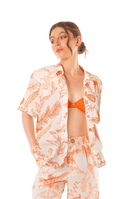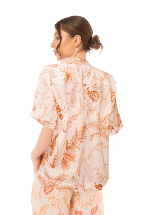 Una prenda fresca y versátil que le dará un toque especial a cualquier look. Esta camisa de manga corta presenta un delicado estampado tropical en tonos cálidos sobre fondo claro, perfecta para crear outfits relajados pero con mucho estilo.