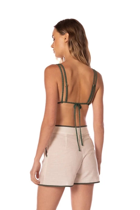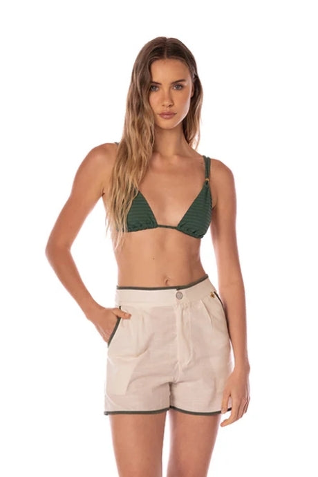 Los Devon Short son la pieza clave para un estilo casual y chic. Hechos en una tela ligera color crema, estos shorts presentan un ribete en contraste color verde Oliva que delinea su silueta, añadiendo un toque de sofisticación. El diseño de cintura alta, bolsillos laterales y pinzas delanteras asegura un fit impecable y cómodo. Ideal para complementar tu beach look o para tus salidas de verano, fusionando confort con la esencia de Summer Gems.