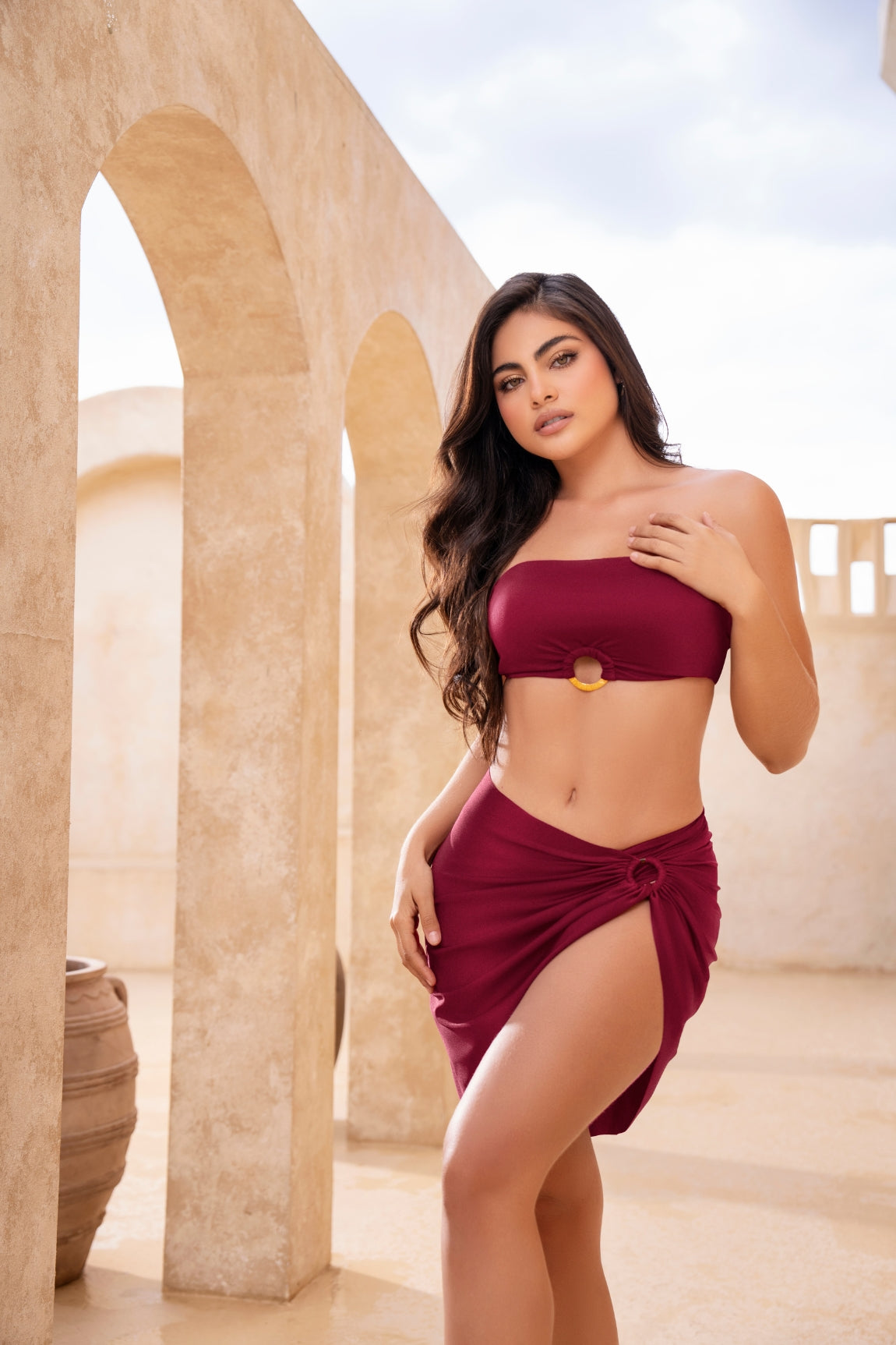 Falda playera en lycra brillante con argolla decorativa que resalta la silueta y aporta un efecto de reloj de arena para un look estilizado y elegante.