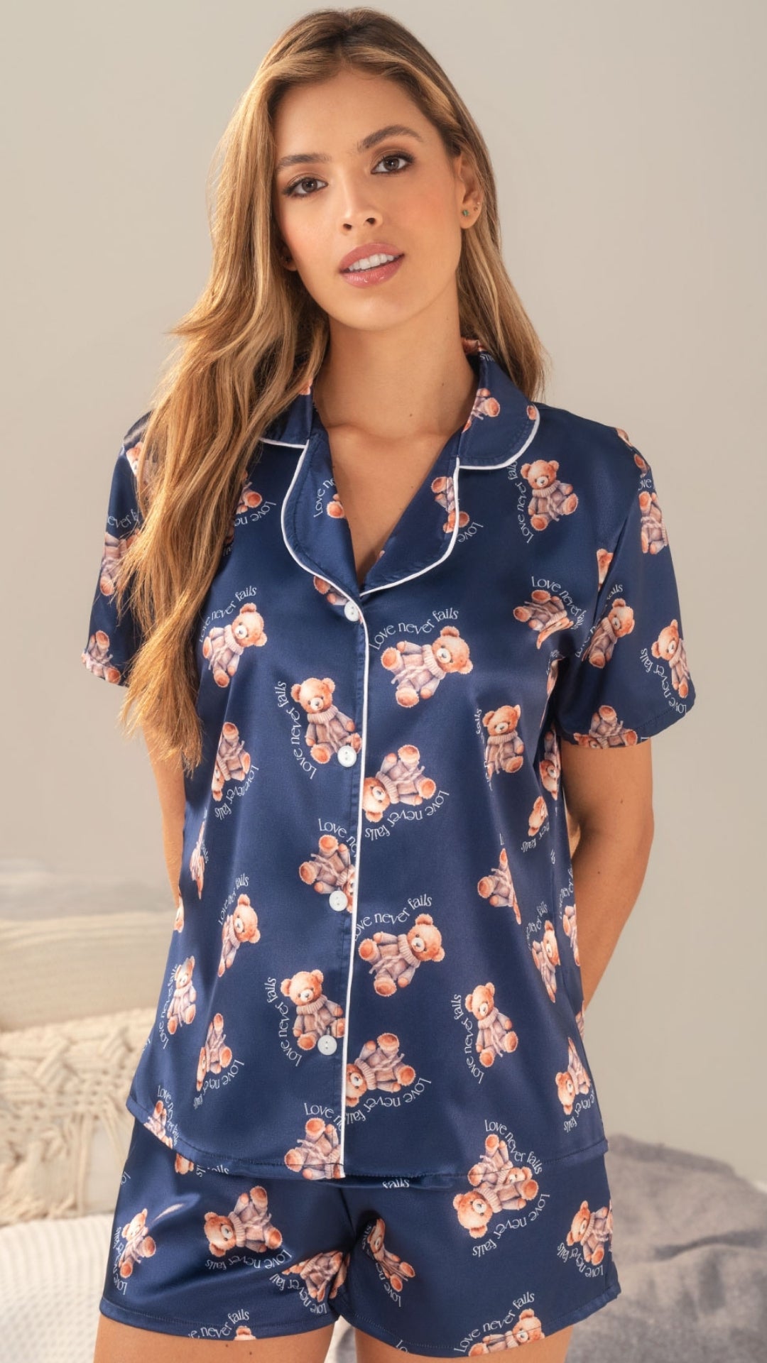 Dale un toque tierno y divertido a tus noches con esta encantadora pijama satinada. El conjunto incluye camisa de botones con cuello tipo camisero y short, ambos en un vibrante tono azul marino decorado con un adorable estampado de ositos. Confeccionada en satén suave y ligero, proporciona una sensación fresca y cómoda para un descanso placentero con mucho estilo.