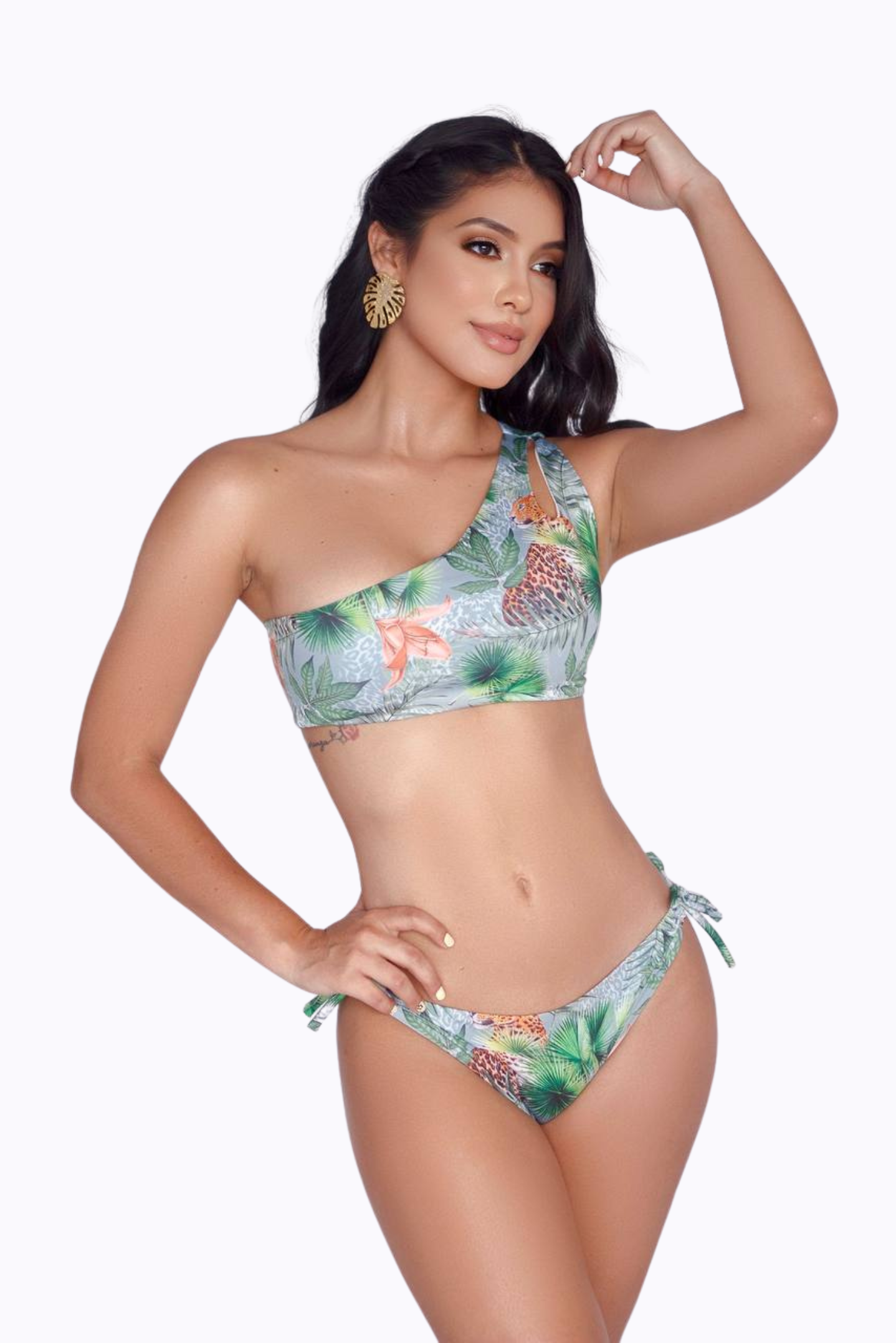 Nuestro Bikini Mara con top en un solo hombro te encantará para tus días de sol. Panty de ajuste a los lados con efecto recogido que realza los glúteos.