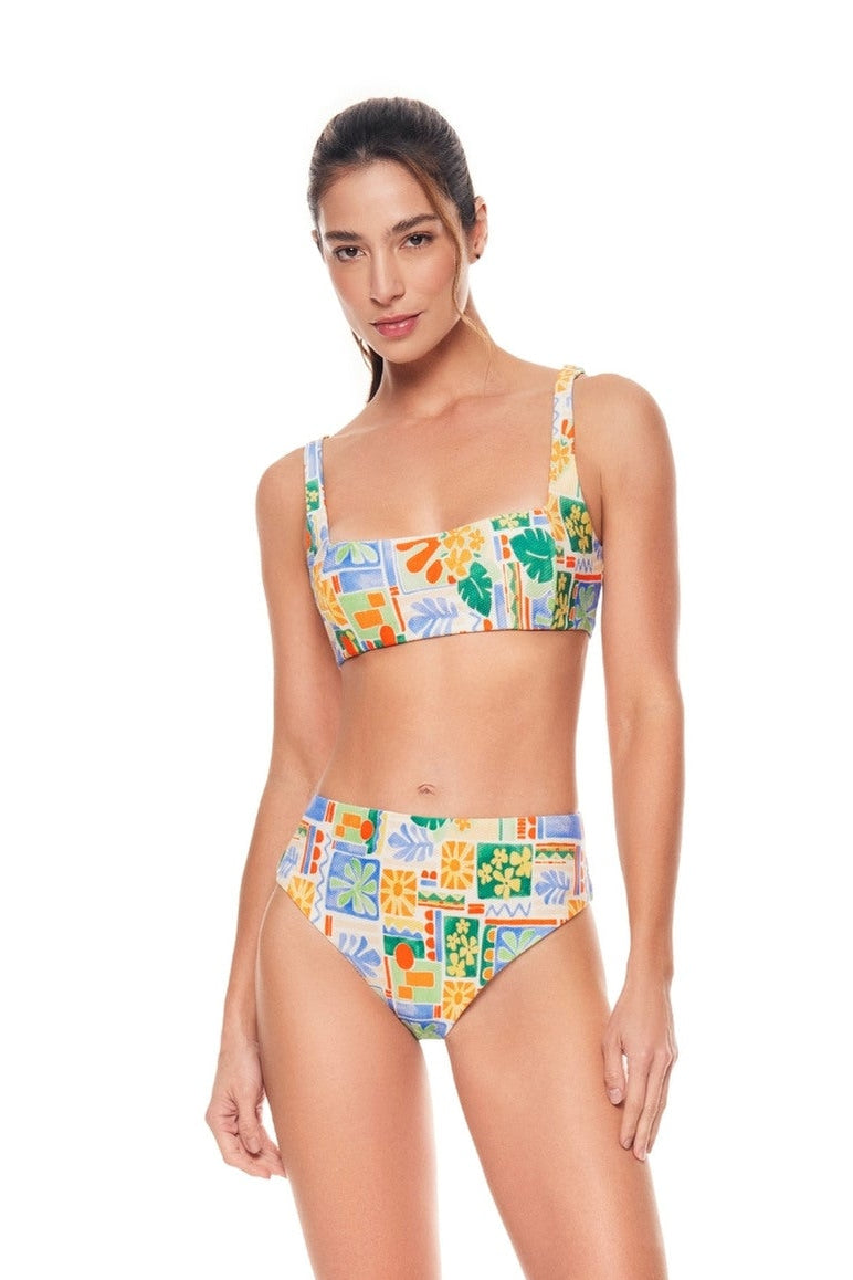 Este bikini de corte alto y top con tiras anchas combina elegancia, soporte y un toque retro irresistible. Su estampado llena tus días de color y energía veraniega, mientras su diseño estructurado ofrece un ajuste cómodo y seguro.