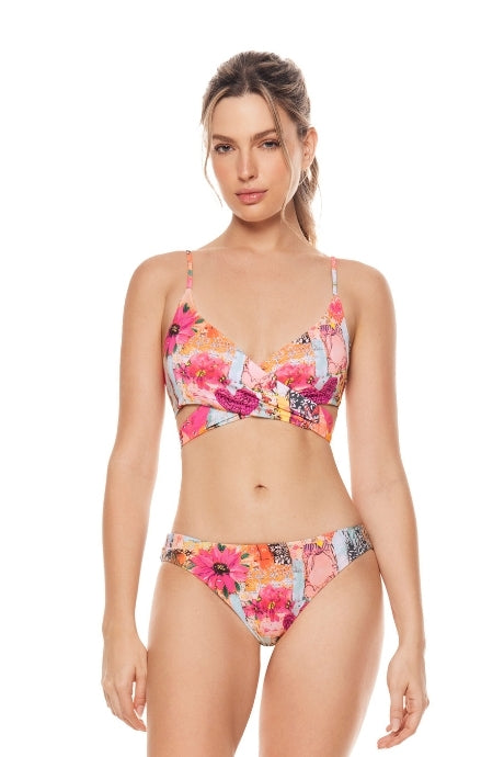 Nuestro bikini de dos piezas destaca por su top cruzado ajustable en la espalda, que brinda soporte y estilo. El panty de diseño simple asegura comodidad, mientras que su estampado floral con corazones en colores intensos y radiantes evoca frescura y un espíritu veraniego.