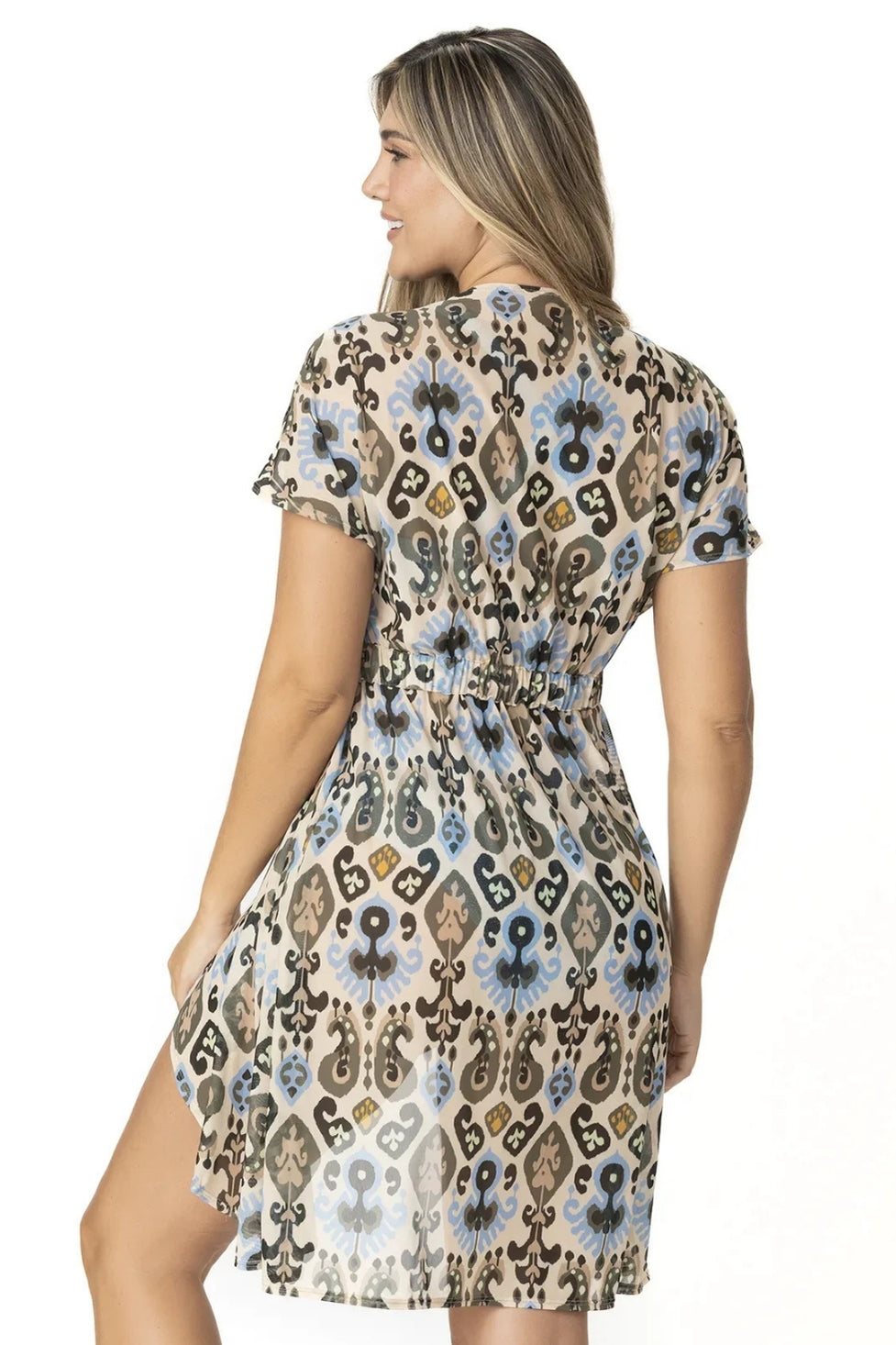 El estampado vibrante llena la pieza de personalidad, convirtiéndola en el complemento ideal para usar sobre bikinis o enteros. Su silueta corta y fluida lo hace versátil y fácil de llevar, perfecto para transitar de la playa a un plan casual con elegancia natural.