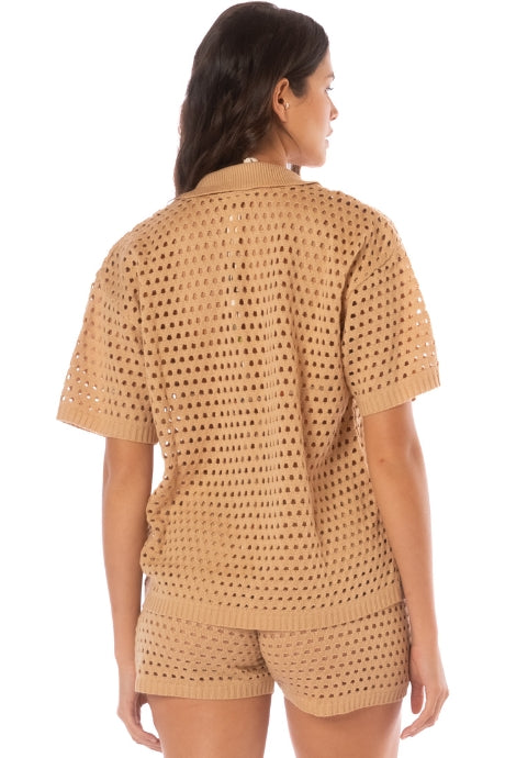 Este conjunto de dos piezas en tono beige es perfecto para los días cálidos. Confeccionado en tejido calado, permite una excelente ventilación sin perder el estilo. El set incluye una camisa de manga corta con botones frontales y cuello clásico, acompañada de unos shorts de tiro alto a juego. Ideal para llevar sobre tu traje de baño o como look casual y chic para la playa o la ciudad.