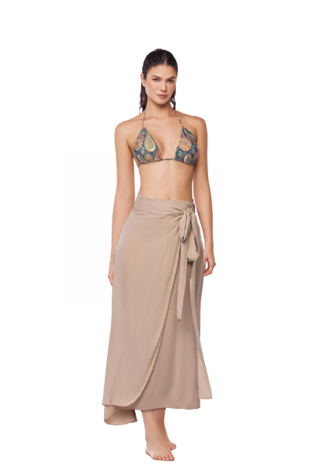 Pareo largo color beige anudado en la cintura con un lazo, esto crea un estilo elegante y fluido. Su diseño permite cubrir la parte inferior del cuerpo de manera ligera y cómoda, ideal para un ambiente veraniego o tropical.