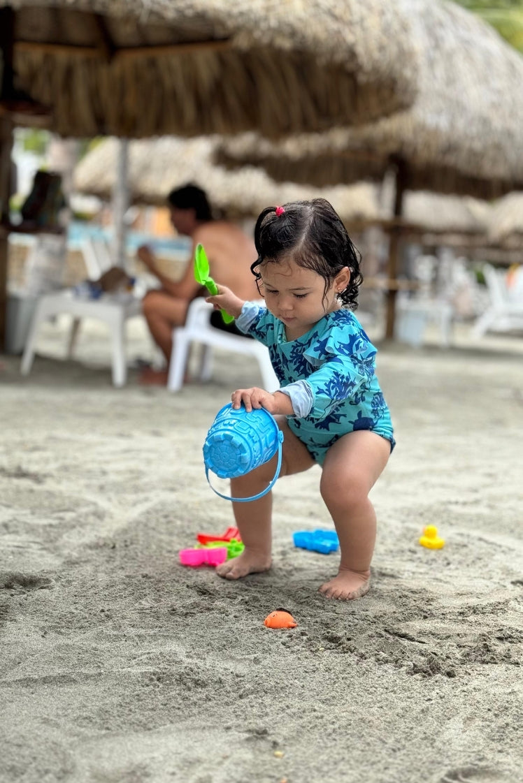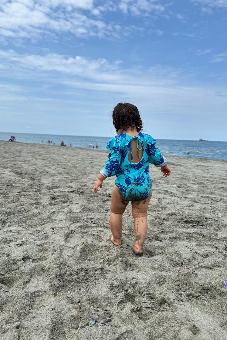 Nuestro Entero Niña Antonia con manga larga protege del sol , con un estilo único el vestido de baño ideal para un día en la playa.