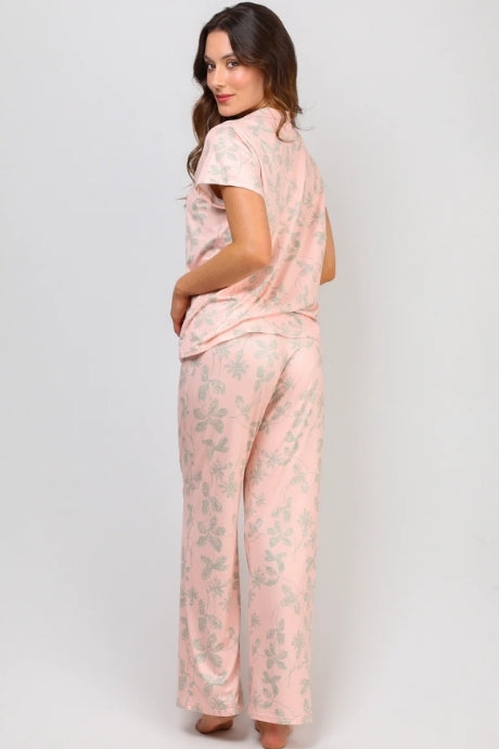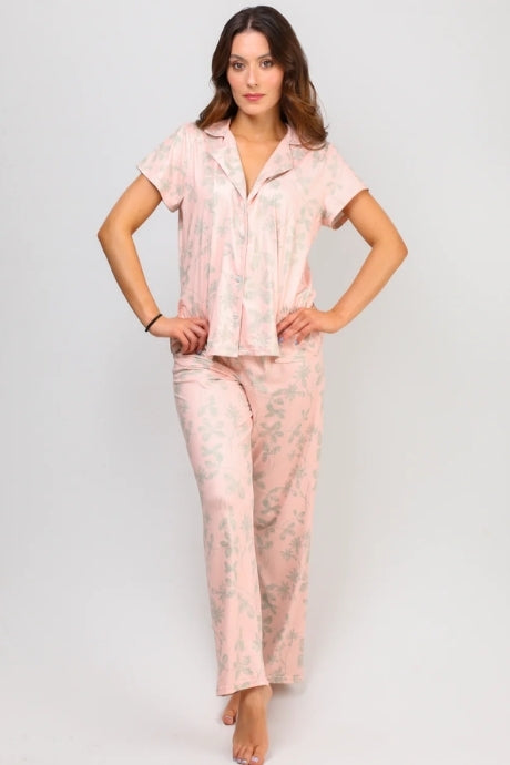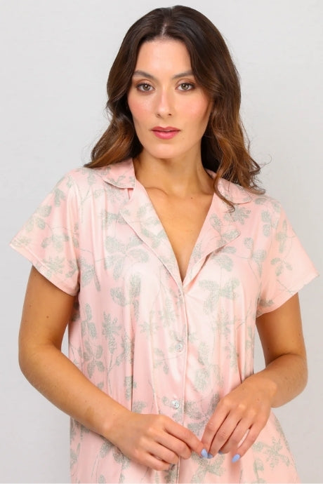 Descubre la suavidad y el estilo con nuestro pijama de dos piezas para mujer, confeccionado en satín ligero de tono rosa suave con un delicado estampado floral. El conjunto incluye una camisa de manga corta con cuello clásico y botones frontales, brindando un toque elegante y relajado. El pantalón largo, de corte recto, ofrece comodidad absoluta para tus noches de descanso. Perfecto para quienes aman sentirse cómodas sin renunciar a la feminidad y el buen gusto. Ideal para el hogar, momentos de relax o como regalo especial.
