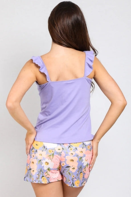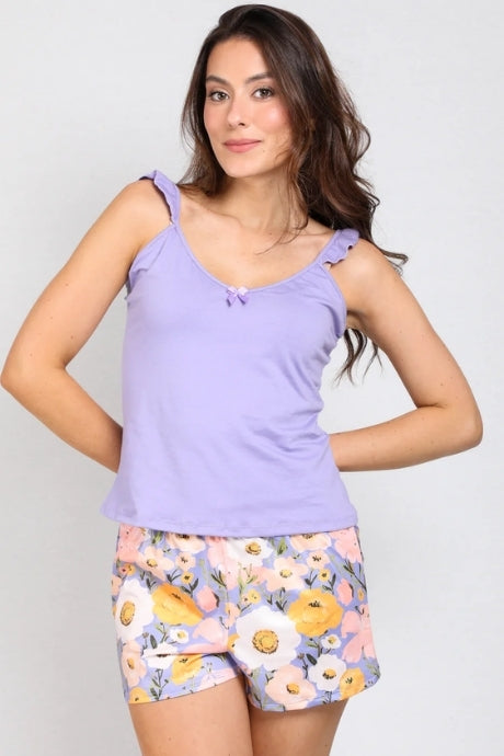 Blusa unicolor manga sisa moño decorativo en escote, short elaborado en base de tejido de punto, efecto satín, de tacto frío y extra suave con estampación digital.